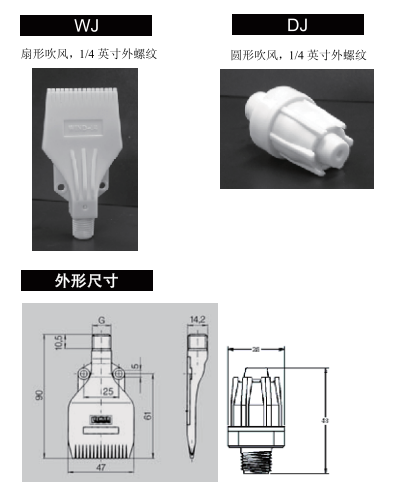 WJ型和DJ型吹風噴嘴可噴出高沖擊力,扇形或圓形的壓縮氣流,專為工藝處理中的各種吹風應用設計。